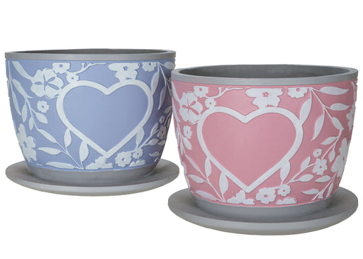 6.5" Pink/Lavender Heart Design Cement Planter w/Saucer, 2 Assorted, 2/cs
