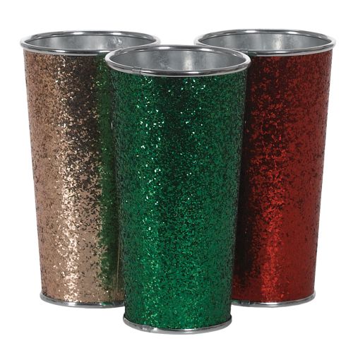 9" Metal Christmas Bling Glittered Flower Bucket, Red, Green, Gold, op: 4.75", 3/pk
