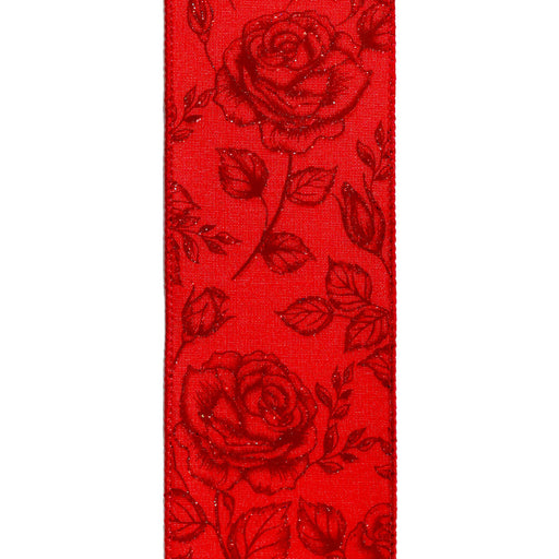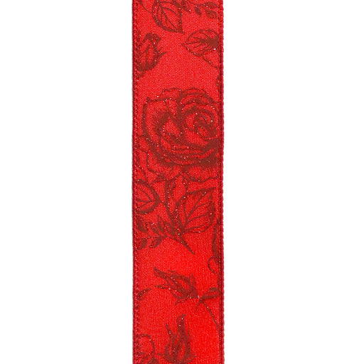 Red Glittered Roses on Red Sheer, 2.5" X 50 yd, 1/rl